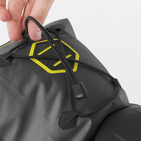 La fermeture roll-top et la valve de compression permettent d’ajuster la capacité selon le volume transporté. Le compartiment principal et le cordon externe offrent un rangement pratique, tandis que les attaches Hypalon et le système à trois points garantissent une fixation solide et stable sur tous types de selles et de tiges de selle.