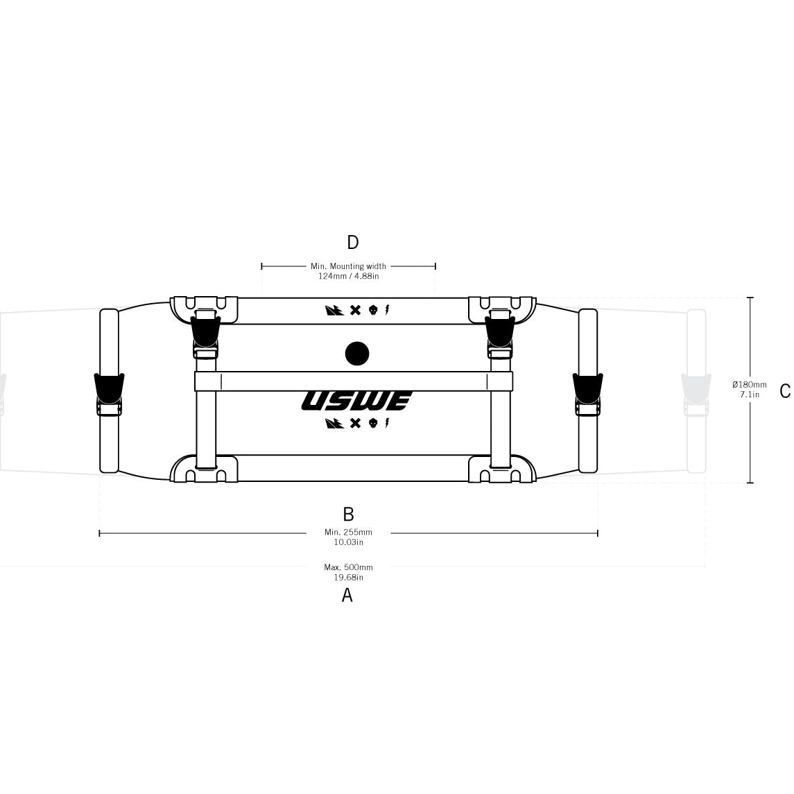 Type of bag: Bikepacking bag Activity: Cycling (MTB, Gravel, E-MTB) Materials: Diamond Ripstop 420D TPU & Hypalon (waterproof and durable) Total volume: 9 L / 304.3 oz Weight (manufacturer): 327 g / 11.53 oz Dimensions : Max width (A): 500 mm Width (B): 255 mm Diameter (C): 180 mm Attachment (D): 124 mm
