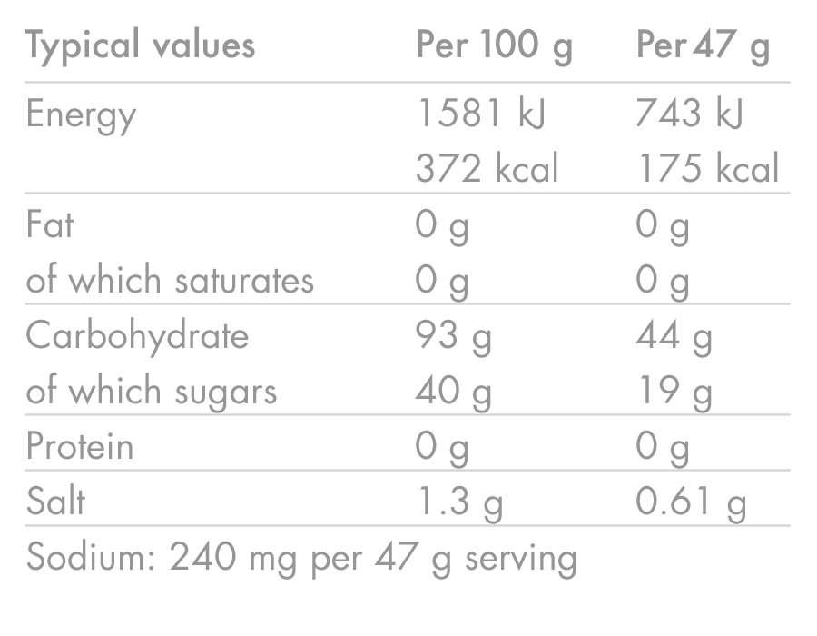 Tento energetický nápoj pro jednu porci má Formula s poměrem maltodextrin : fruktóza 2:1pro maximální vstřebávání sacharidů (až do 1,5 %). 90 g/hod.) při zachování optimální hydrataci díky vyváženému přísunu elektrolytů.