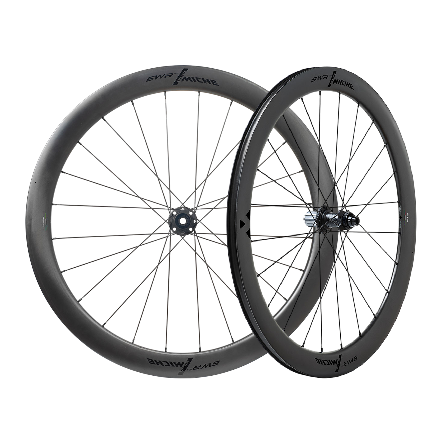 Na . Hliníkové náboje 7075-T6náboje, odlehčené CNC obráběním, obsahují schéma 16+8 polic pro maximální tuhost a odezvu. Nastavovací kroužek umožňuje přesné nastavení hladkosti ložisek. S bezdušovým kolem SWR EVO 50 DISC nabízí společnost Miche rychlé a spolehlivé kolo, které je určeno pro závody.