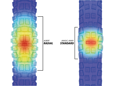 Schwalbe přehodnocuje konstrukci plášťů pro horská kola: místo klasického diagonálního výpletu jsou kordy umístěny pod tupějším úhlem, což umožňuje přesnější deformaci pláště. Díky tomu plášť mnohem lépe kopíruje nerovnosti než plášť s diagonálními vrstvami a vždy udržuje kontakt s vozovkou. Výsledek: větší přilnavost, větší pohodlí a větší bezpečnost na silnici. Navíc se při stejném tlaku zvětší styčná plocha přibližně o 30 %.